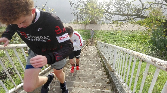 Samedi 12 novembre footing 30' puis (3 x 50 marches) x 3 avec 2' de récup entre chaque série. Test gainage (abdos-pompes-planches). Amplitude des scores (écart entre le meilleur et le plus faible) aux pompes : 17/30 -abdos 16/88 - planche 1'19"/2'28".