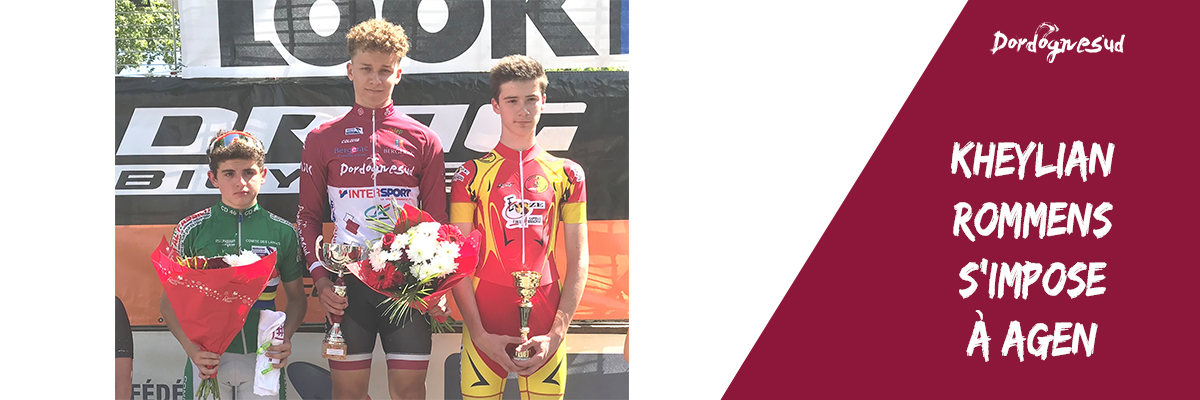 Kheylian Rommens, déjà champion de Dordogne sur route cadets s'est imposé dimanche à Agen (FFC). Sascha Bowen termine dans le peloton.